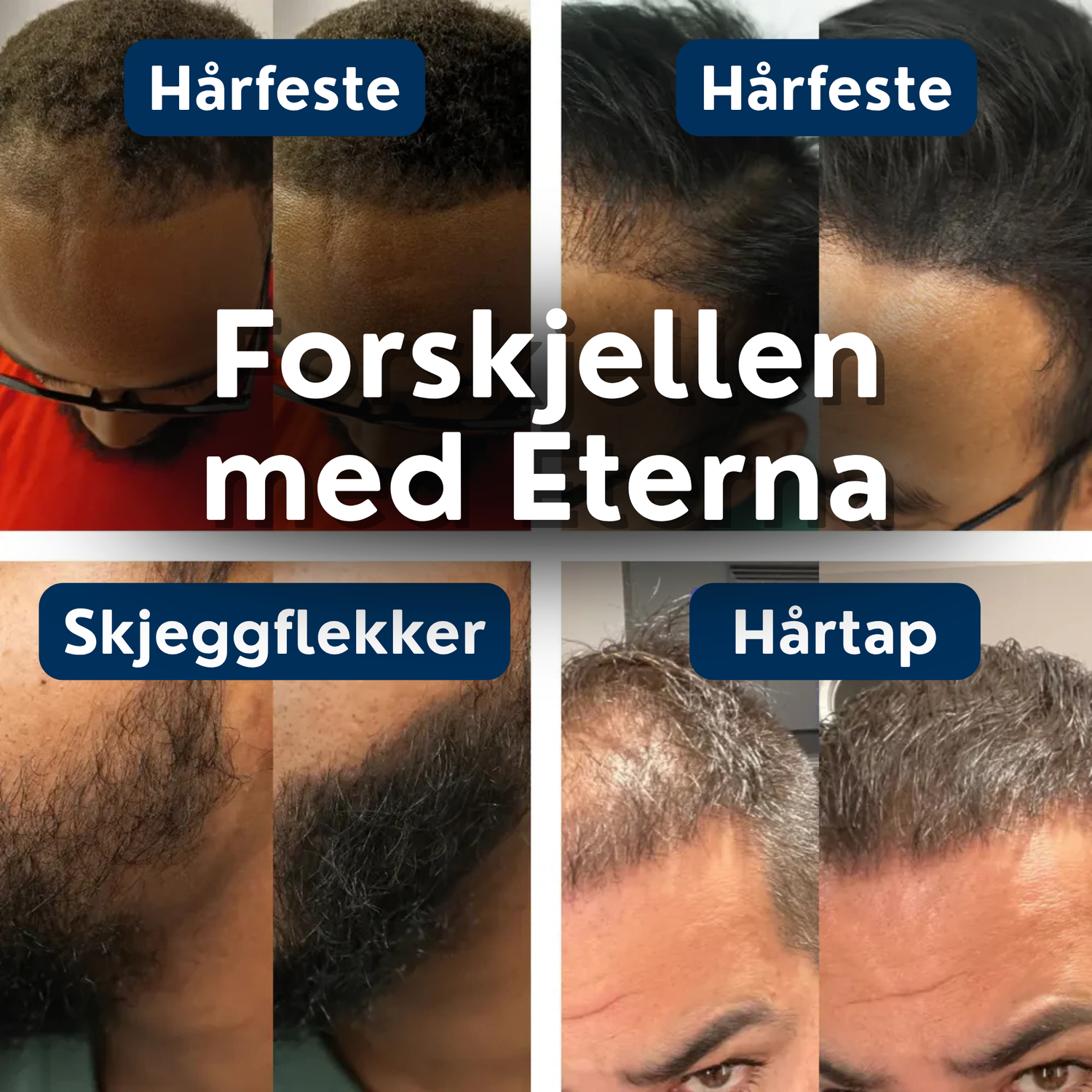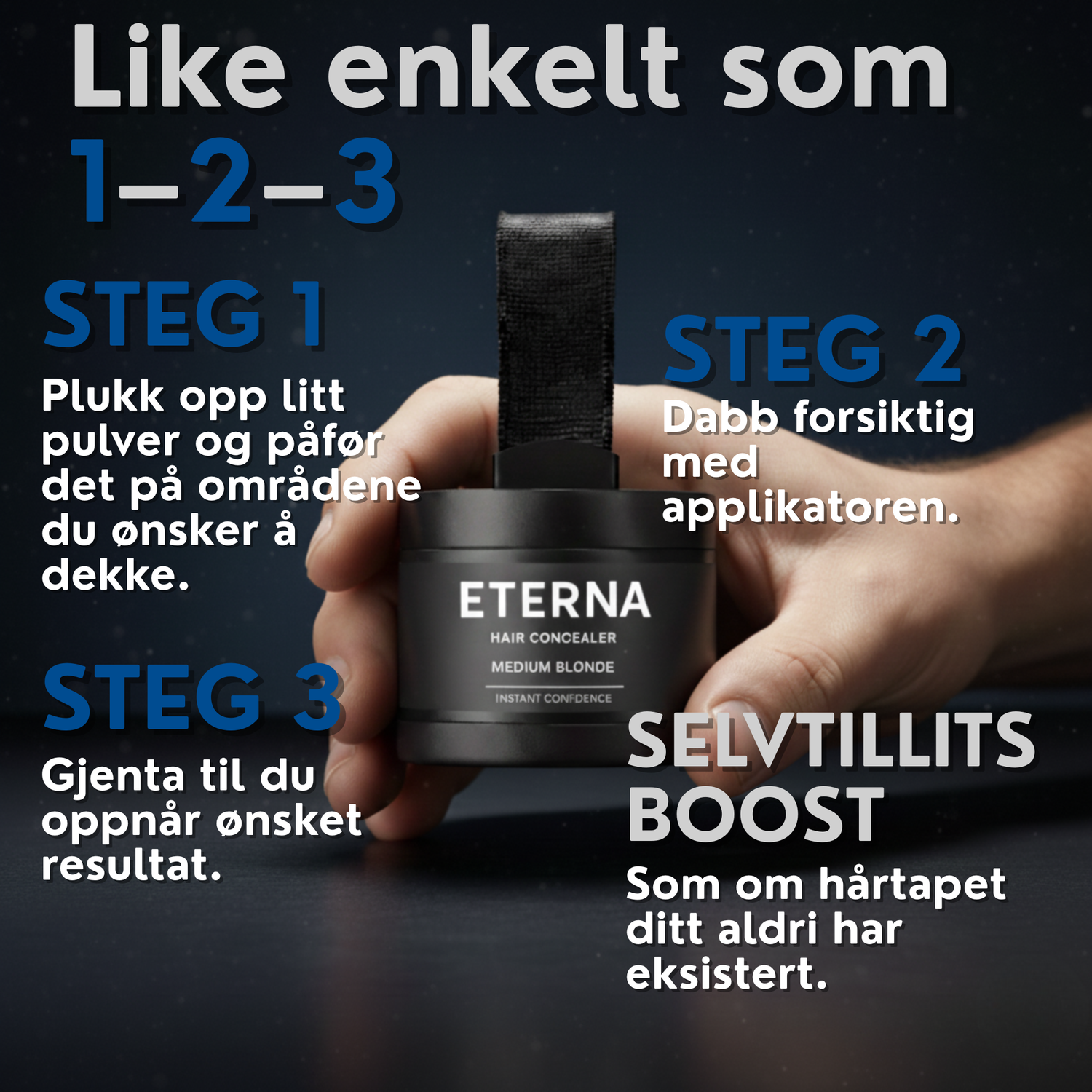 Eterna er et øyeblikkelig kamufleringspulver som magnetisk binder seg til hvert eneste hårstrå – til og med de mikroskopiske, lyse hårene du ikke kan se med øyet. Resultatet er naturlig fylde og tetthet på bare 10 sekunder – uten kirurgi, uten behandlinger, uten stress.